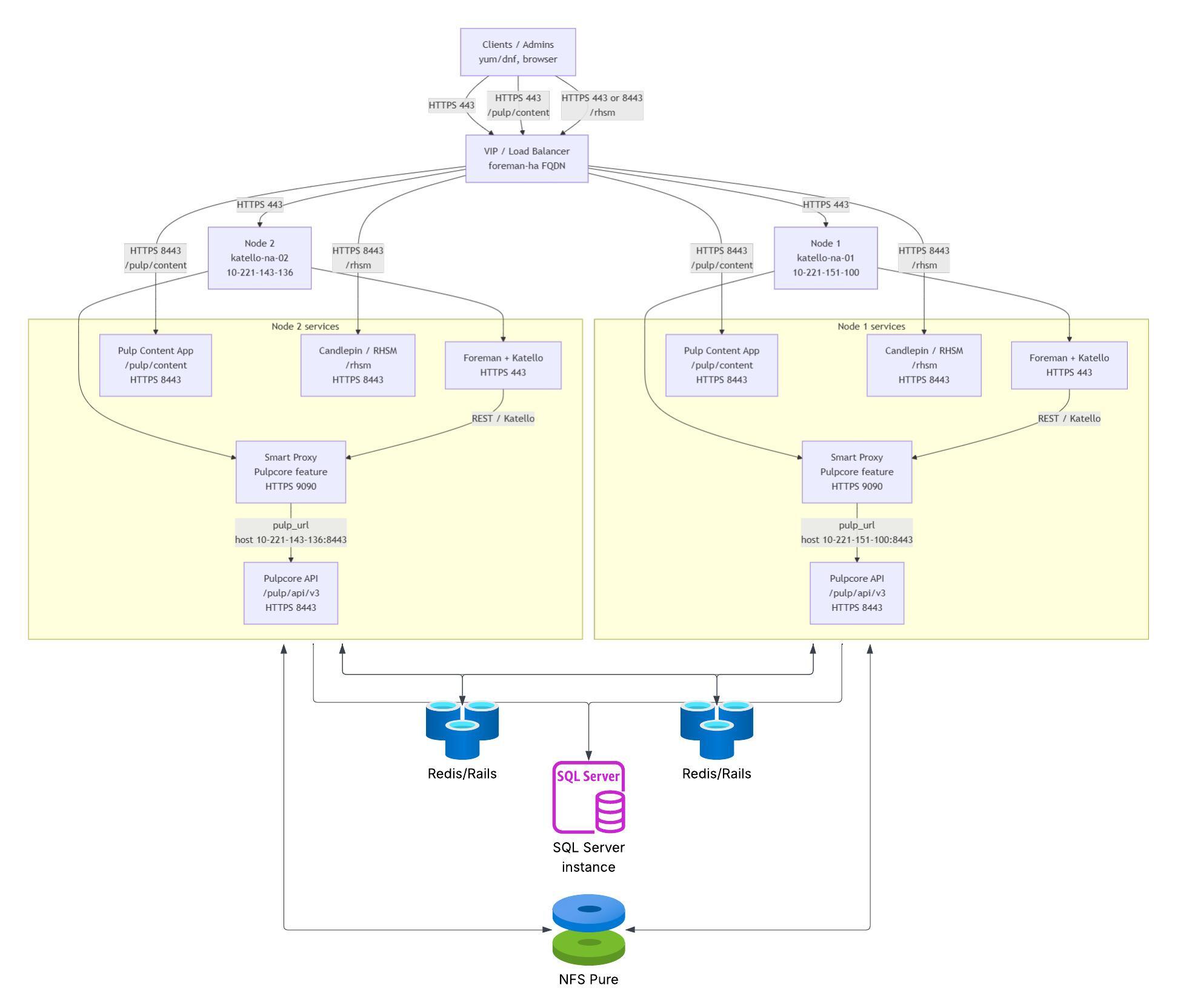 Here is our environment. We created our own High Availability and expandable Infrastructure. Yes, this is far off what Satellite recommends, I assume because of the complexities, but its all working.