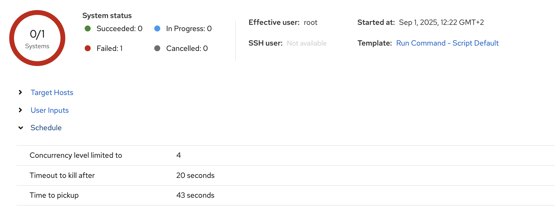 The top of the page features a comprehensive job overview. You’ll find key information at a glance, and it also includes expandable sections for Scheduling, Recurring logic, Targeting Hosts, and User Inputs.